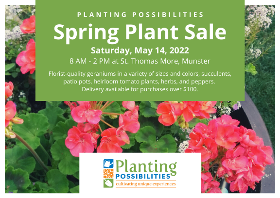 Saturday, May 14th is Flower Sale Day - just in time for Spring! The Planting Possibilites annual Spring fundraiser is back - in person - on Saturday, May 14 at the St. Thomas More south parking lot in Munster.