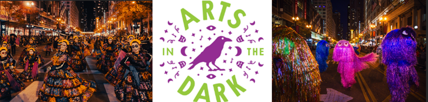 While the Arts in the Dark parade is a Halloween event, the participants are not bound by a Halloween theme; each group is invited to showcase who they are as an organization with music, dance, costumes, and other dramatic visual elements. This year’s parade will feature 3 colleges, 8 high schools, 20+ dance companies, and 15+ music groups across many genres. The parade features an array of cultural and ethnic groups, including a powerful representation of Black and Mexican cultures. Additionally, the parade will feature Irish, Colombian, Brazilian, South Asia, Korean, Puerto Rican, Caribbean, Peruvian, and LGTBQ+ organizations and groups. These and many more groups and artist collectives capture the expanse of Chicago’s cultural landscape in areas including film, museums, visual arts, theatre, architecture, drag performance, fashion, dance, circus arts, creative youth, hip-hop, jazz, rock, opera, gospel and house music, street arts, fire arts, drumlines, puppeteers, literary arts, and much more.