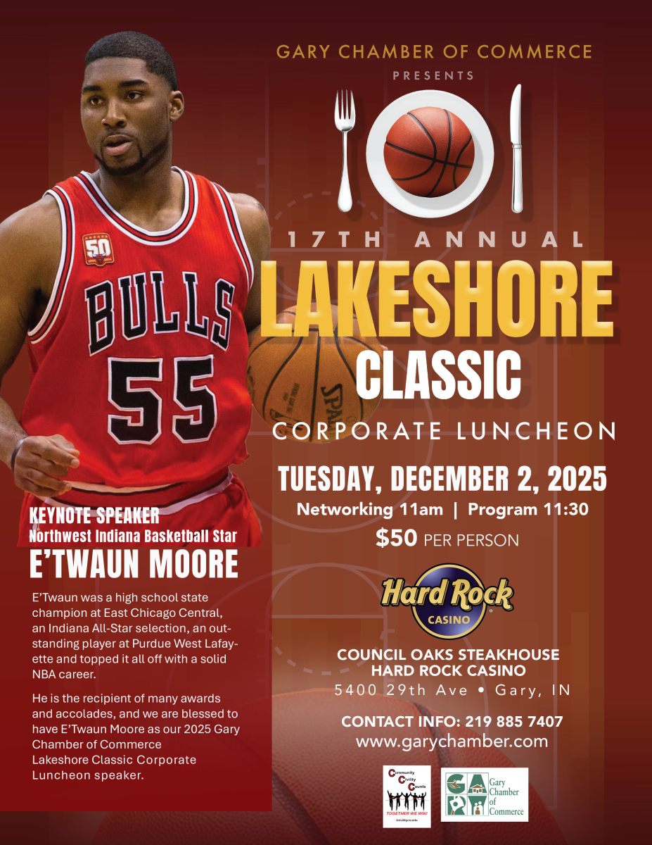 The Gary Chamber of Commerce is hosting the 17th Annual Lakeshore Classic Luncheon at the Hard Rock Casino Northern Indiana on Tuesday, December 2nd, 11:00 am. The keynote speaker will be Northwest Indiana and Chicago Bulls basketball star, E'twaun Moore.
