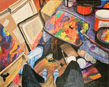 Kerri Mommer, Studio Chaos, mixed media (acrylic on map on canvas), 16 x 20 in. ©Kerri Mommer