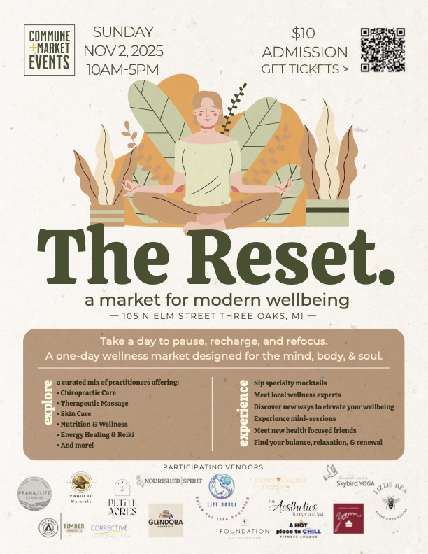 Commune + Market invites the community to take a day to pause, recharge, and refocus at The Reset: A Market for Modern Wellbeing on Sunday, November 2, 2025, from 10:00 AM – 5:00 PM Eastern (9:00 am - 4:00 pm Central), at Commune + Market, 105 N. Elm Street, Three Oaks, Michigan.