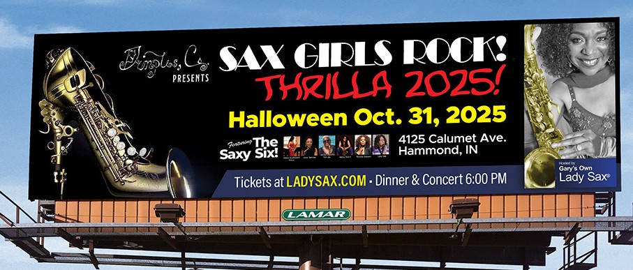 Please contact me personally at my home office phone 219-887-7729 or by email; ladysaxofgary@gmail.com. SUBJECT: SAX GIRLS ROCK! THRILLA! 2025 You may also contact me at my website: www.ladysax.com for details on my upcoming promotions and to book me for future events.