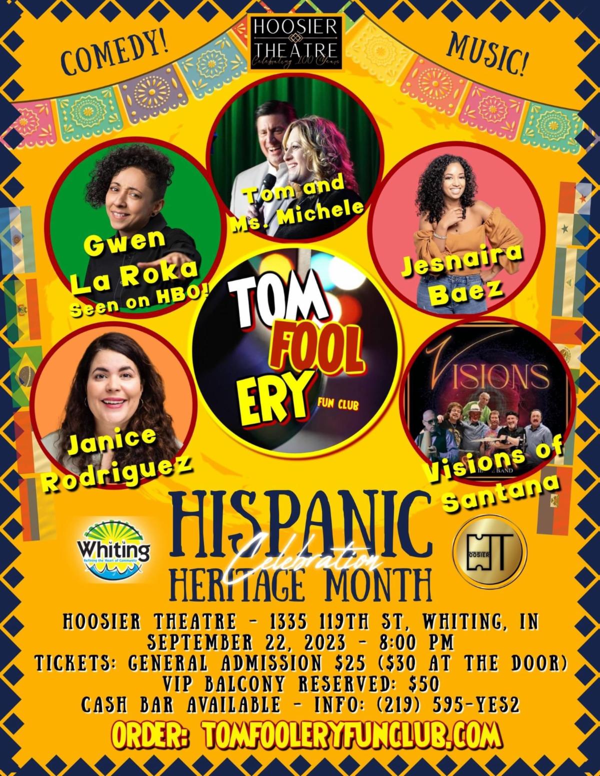 Tomfoolery joins in the celebration of Hispanic Heritage Month with a very special event! We return to the iconic Hoosier Theatre in Whiting, IN with a stellar lineup of comedic and musical talent on September 22, 2023!