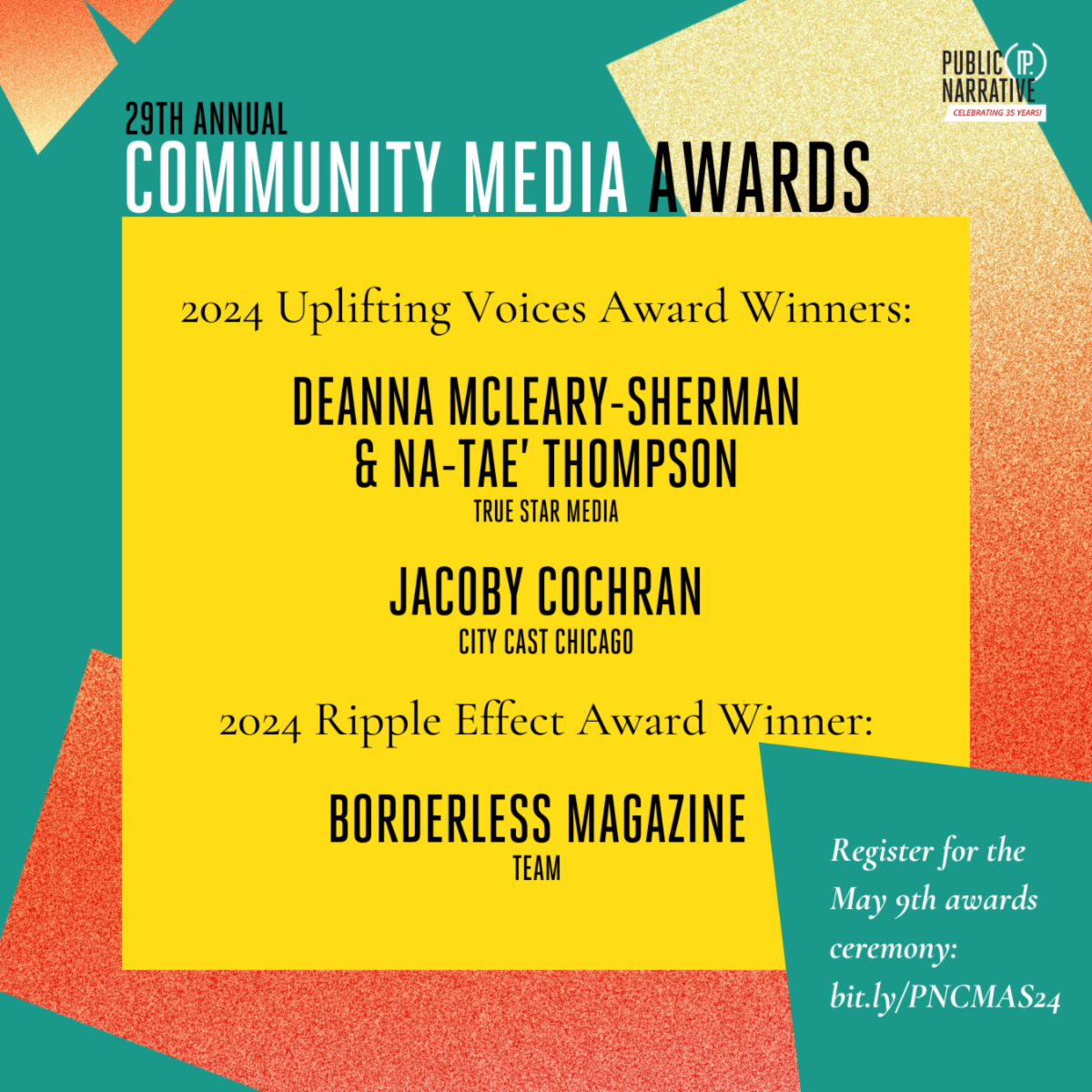 Public Narrative has championed narrative change for 35 years and has recognized impactful journalism through the Community Media Awards since 1994. Our mission includes supporting journalists and storytellers who make a difference in our communities and embody the spirit of the awards’ muse, Studs Terkel. Learn more at publicnarrative.org.