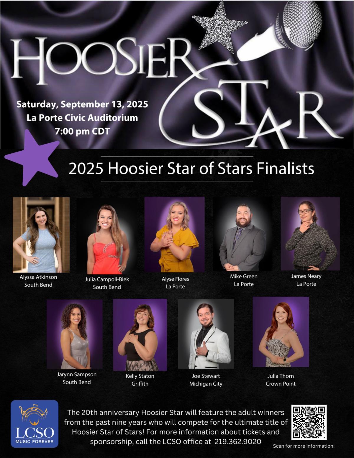 The La Porte County Symphony Orchestra is pleased to announce that the 20th Annual Hoosier Star vocal competition will take place on September 13, 2025 at the La Porte Civic Auditorium and will feature the adult winners from the nine prior Hoosier Star competitions who will compete for the prestigious title "Hoosier Star of Stars", as well as a cash prize. The finalists will sing their winning song accompanied by the La Porte County Symphony Orchestra under the baton of Music Director Dr. Carolyn Watson.
