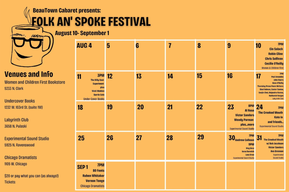 BeauTown Cabaret presents the return of the Folk an’ Spoke Festival, August 10 - September 1, at locations throughout Chicago. The Folk an’ Spoke Festival, is curated by the godfather of Chicago fringe Beau O’Reilly and celebrates Chicago’s rich music, poetry and theatre scenes with a series of events. The complete schedule of performances and to reserve pay-what-you-can tickets, suggested donation $20, go to BeauOReilly.com.