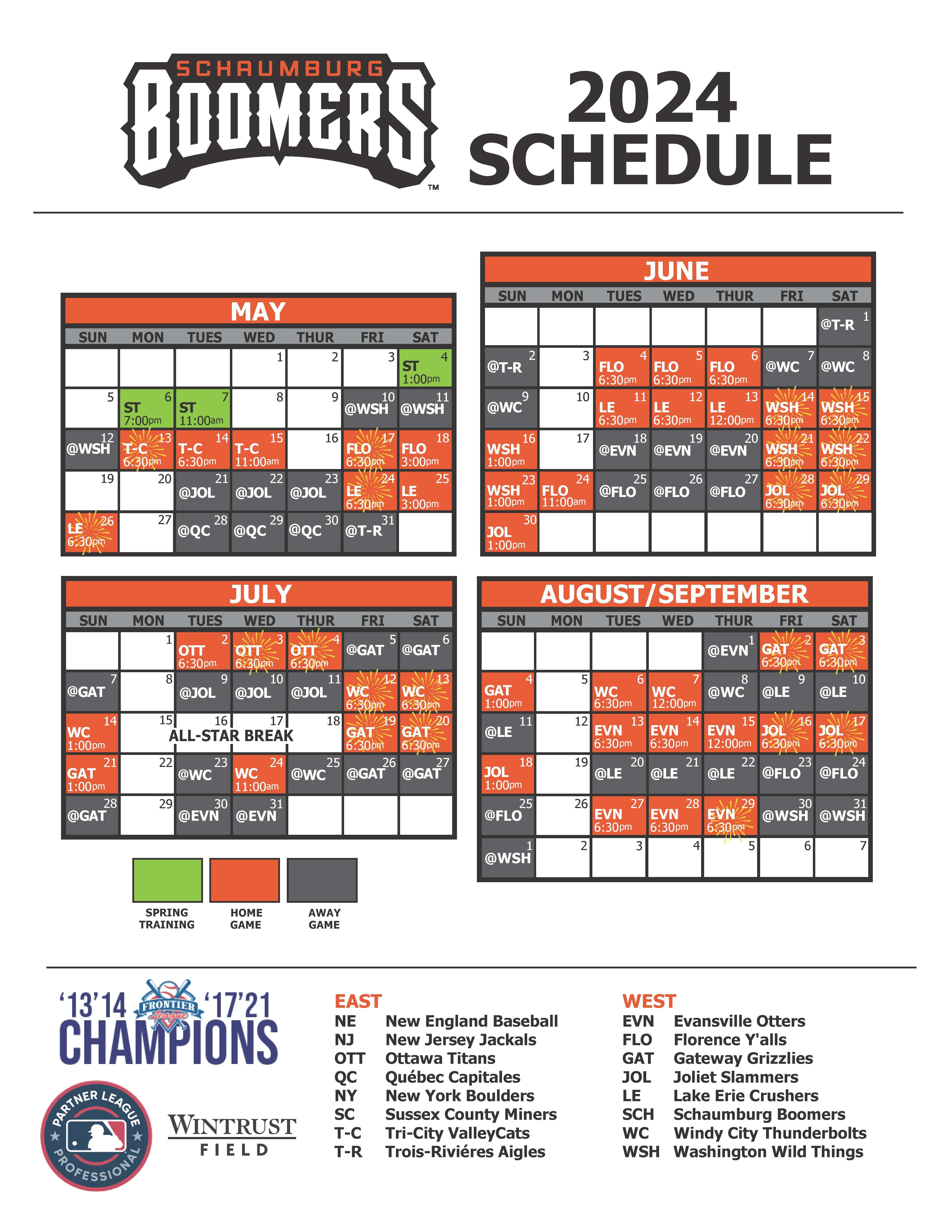 The Schaumburg Boomers are excited to announce the 2024 Frontier League schedule, including game times for all 48 home games at Wintrust Field.