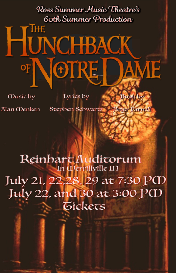 M & M Productions and Ross Summer Music Theatre present RSMT's 60th Summer production, HUNCHBACK OF NOTRE DAME, July 21st through 30th at Reinhart Auditorium, Merrillville High School, 276 East 68th Place, Merrillville.