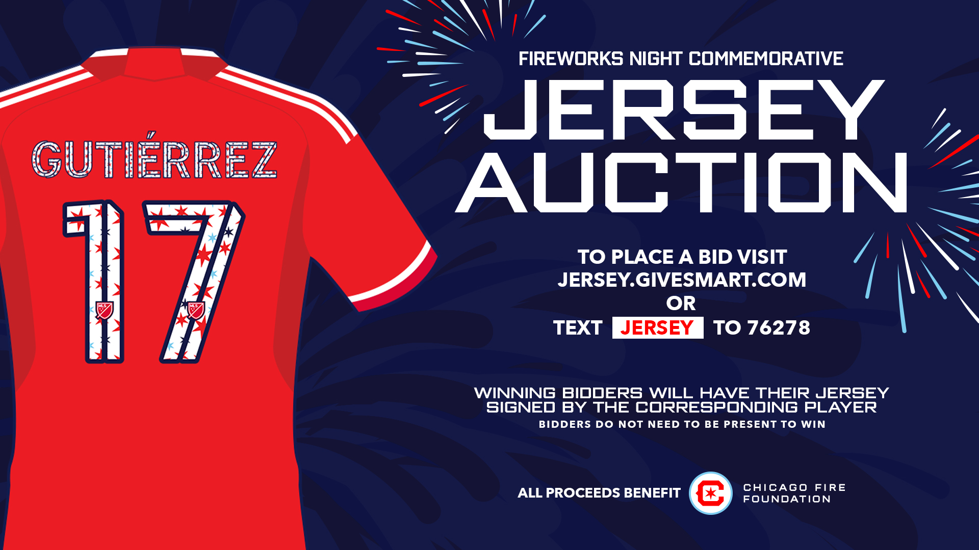 The Fourth of July Commemorative Jersey Auction, officially launching today and running through the end of halftime during the July 3 match, will feature jerseys from all First Team players. Fans can visit jersey.givesmart.com or text “jersey” to 76278 to place a bid or can visit the Chicago Fire Foundation’s table located at Section 138 near the Midway Club during the July 3 match, where Foundation staff will be onsite to assist in bidding. All payments will be processed through an online system and will be accepted on site. Winning bidders who will be present at the match will have the opportunity to have their jersey signed in-person by the corresponding player after the match. Winning bidders who are unable to attend the match will have their autographed jersey mailed to them. For more information on the Fourth of July Commemorative Jersey Auction, please click here.