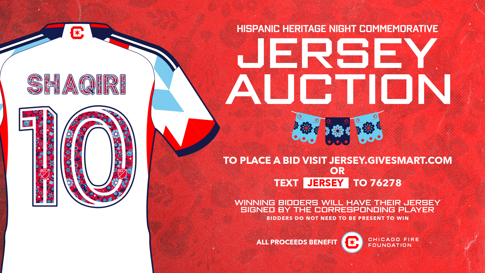 Chicago Fire FC today announced the launch of the Hispanic Heritage Commemorative Jersey Auction, with all proceeds benefitting the Chicago Fire Foundation’s P.L.A.Y.S. (Participate, Learn, Achieve, Youth, Soccer) Program. The jerseys, which will be worn by Fire players during the Club’s Sept. 23 Hispanic Heritage Night match versus the New England Revolution, and autographed post-match, feature limited-edition, specially designed numbers on the back of the jersey, in honor of Hispanic Heritage Month. The Auction opened this morning at 10:00 a.m. CT and will close at the end of halftime during the Sept. 23 match.