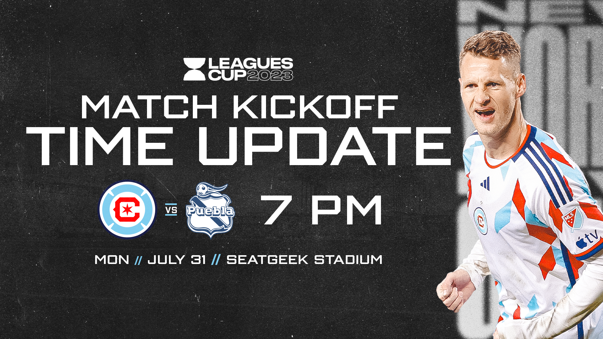 Chicago Fire FC and Leagues Cup 2023 today announced a time change for the match against Club Puebla on Monday, July 31 at SeatGeek Stadium in Bridgeview, Ill.