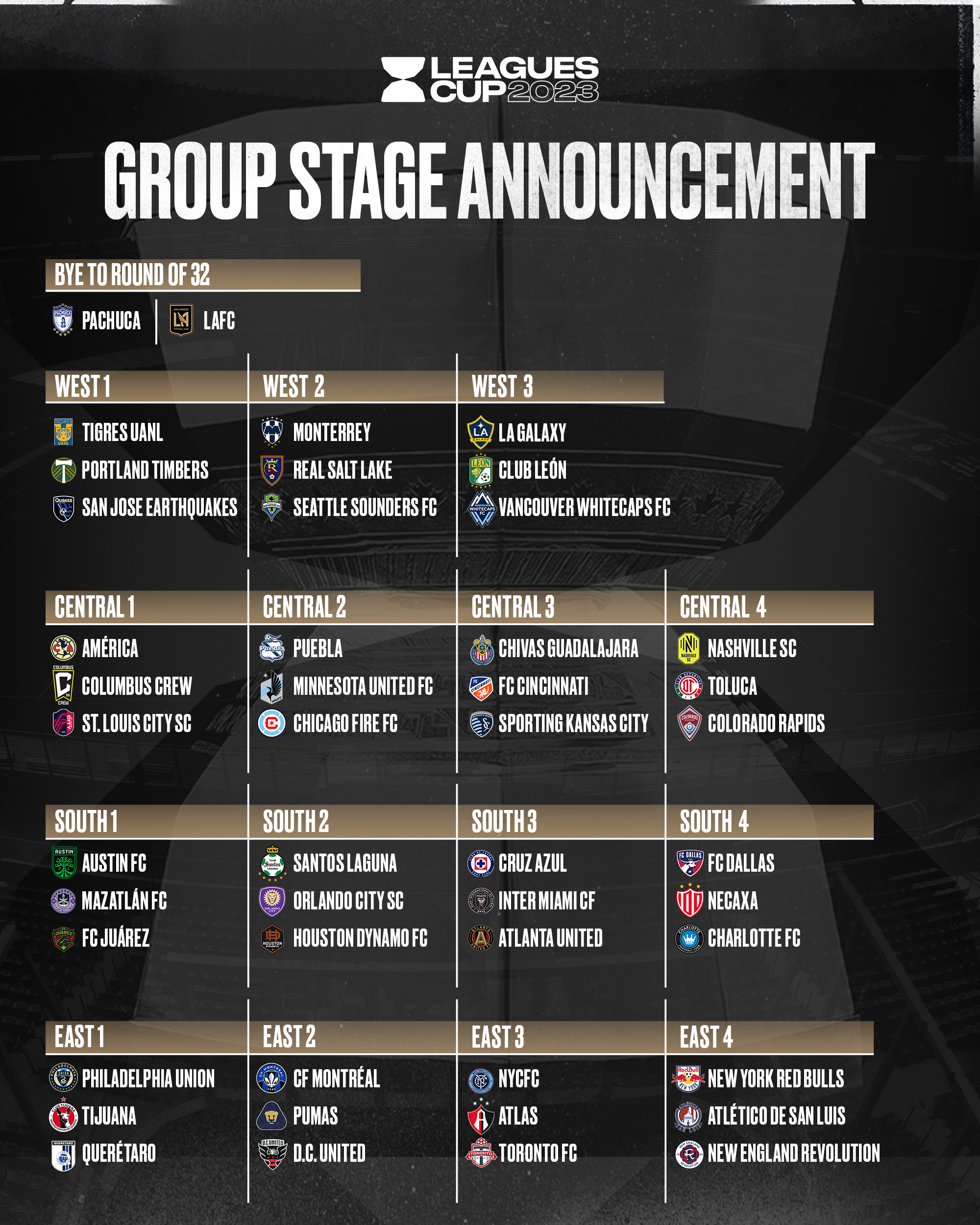The Leagues Cup 2023 groups are based on clubs' 2022 performance along with their geographic regions. The 15 groups will be broken up into four regions: West, Central, South and East. Each region will have four groups, except the West, which will have three groups due to LAFC’s entrance in the Knockout Stage. Pachuca will enter the Knockout Stage in the South, opposite side of the bracket from the MLS Cup Champion and opposite quadrant from the top MLS seeded club based on the final 2022 Supporters’ Shield standings. Since LAFC won the 2022 Supporters' Shield, the club in the opposite quadrant will be the team that finished second – the Philadelphia Union, who will be in Group 1 in the East Region (East 1).