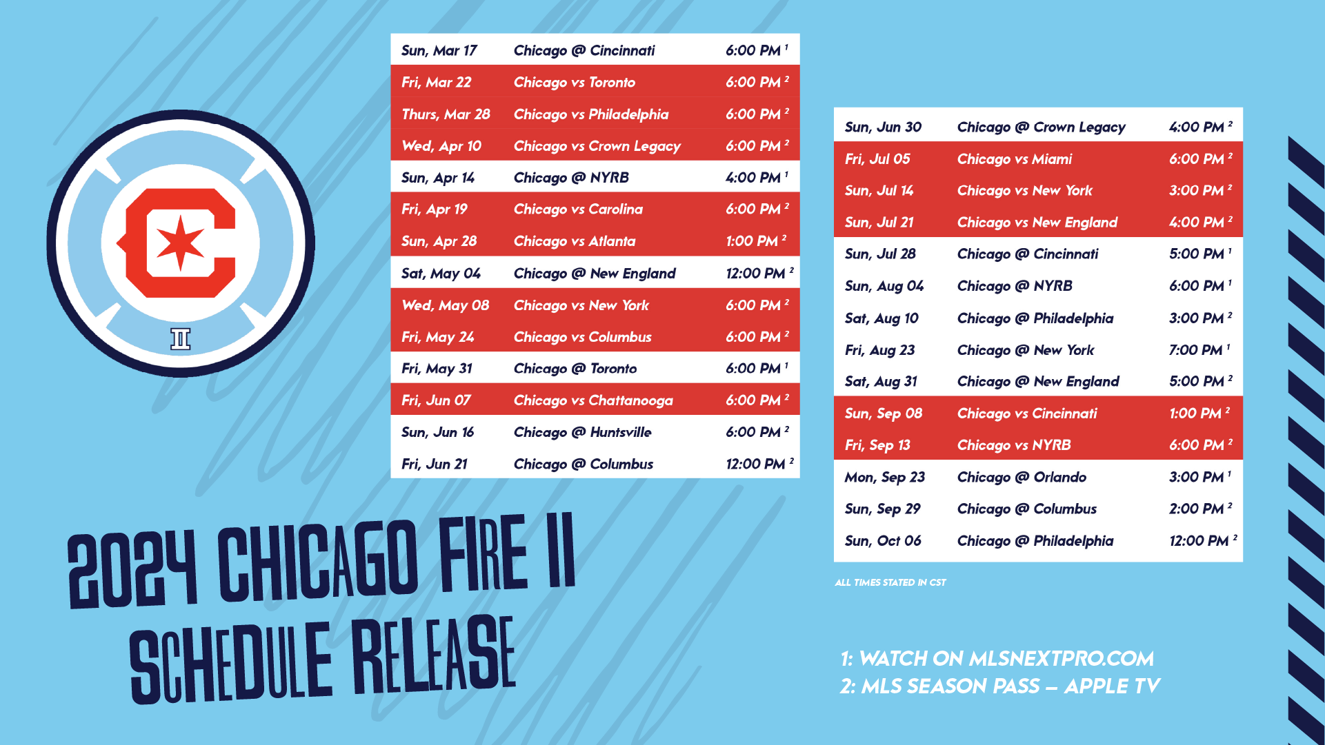 MLS NEXT Pro and Chicago Fire FC today announced the Club’s 28-game schedule for the 2024 MLS NEXT Pro regular season. Chicago will open the season on the road against FC Cincinnati 2 on Sunday, March 17, at Northern Kentucky University, and will host Toronto FC II in the team’s home opener on Friday, March 22, at SeatGeek Stadium in Bridgeview, Ill. The match against Toronto will be broadcast on MLS Season Pass on Apple TV.
