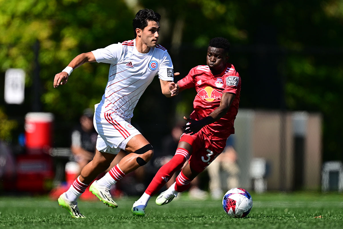 Hosting its inaugural MLS NEXT Pro Playoff match, New York pushed forward from the onset of the match. Following multiple forays into the Fire box within the opening 10 minutes, the Red Bulls earned their fifth corner kick. Wiki Carmona stepped up to deliver a perfect cross to Frank Ssebufu, whose opening goal set the tempo for the rest of the half.