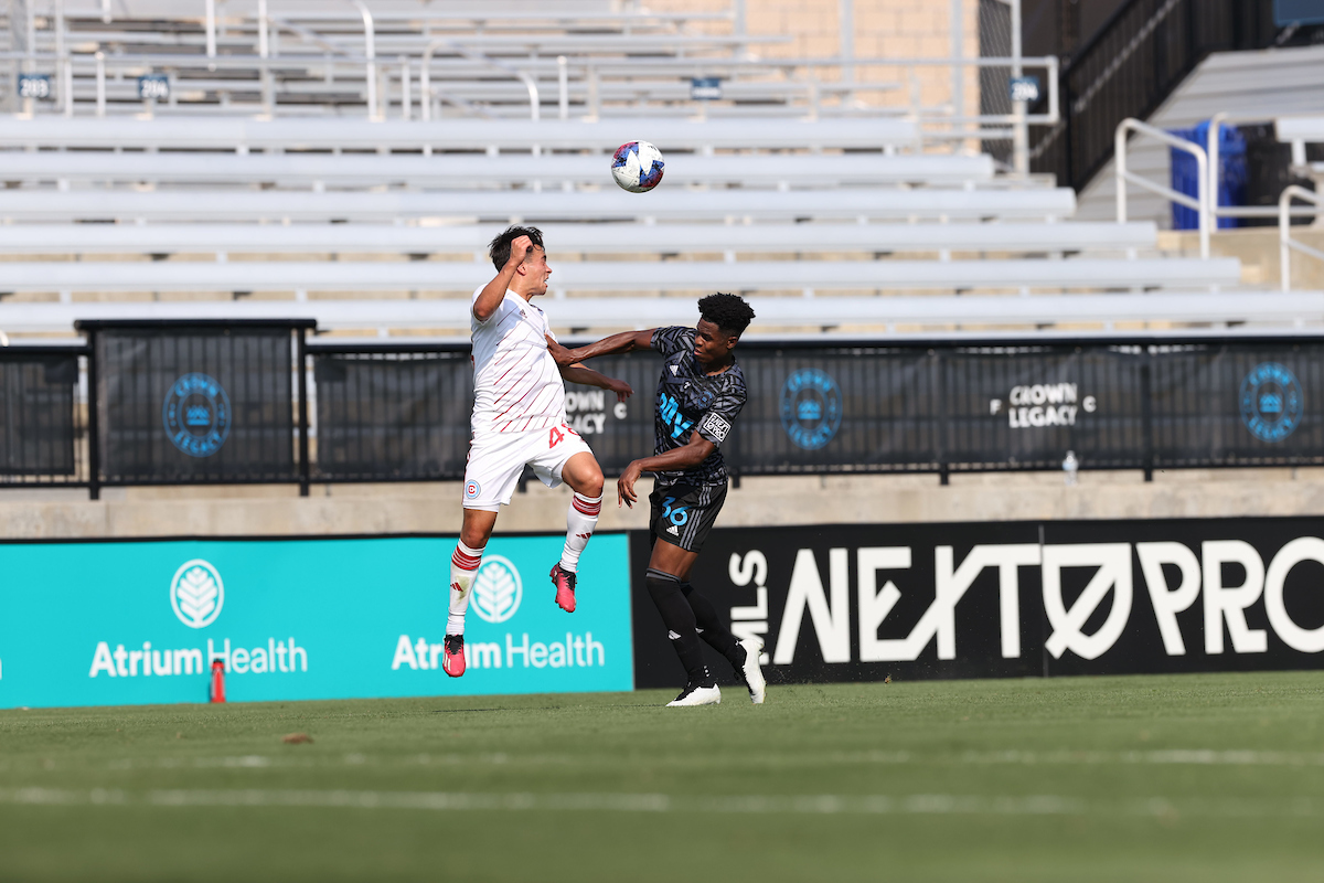After withstanding a withering press in the opening 15 minutes, the Fire regained their footing and found a few looks of their own in the first half. In the 25th minute, Richard Fleming III lofted a ball to Glasgow on the right. Fresh off a goal-scoring performance in the 2023 Concacaf Gold Cup preliminary round for Guyana, the wingback bent a ball from 20 yards out and into the far corner of the net. Glasgow’s second goal of the year stunned the crowd as the teams reached a 30th minute hydration break on a hot summer afternoon in North Carolina.