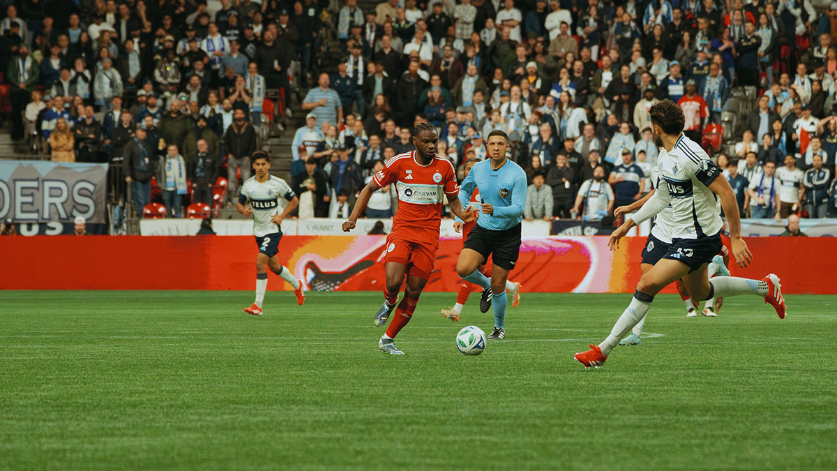 Finding themselves trailing a match for the first time all season, Vancouver struck back in the 14th minute. Liam MacKenzie recovered the ball in the final third before passing to Jayden Nelson, who played a quick ball to Daniel Ríos on the left of the box. The Mexican forward blasted a quick one-timer high off the near post and into the goal for the equalizer.