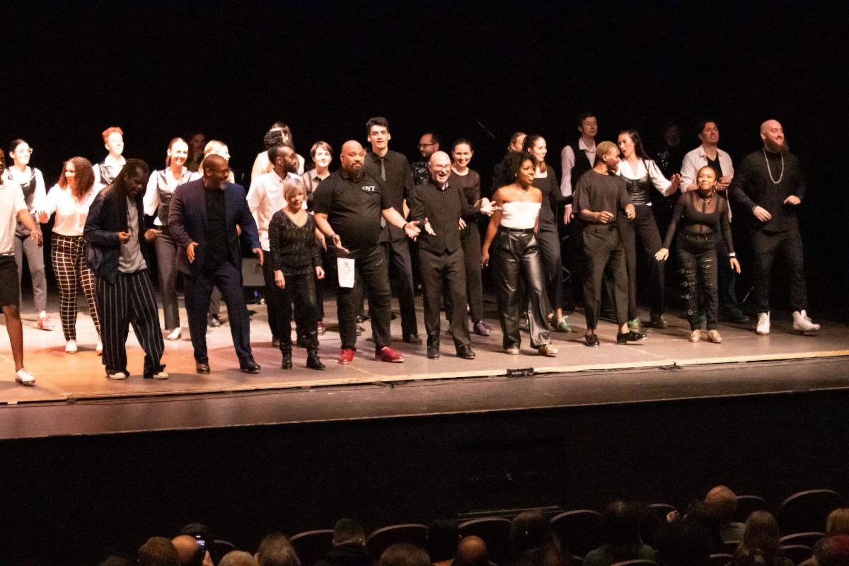 Members of Chicago Tap Allstars dance the “Shim Sham” together. (L to R): Reggio " the Hoofer" McLaughlin, Bril Barrett, Patti Vickerman, Tre Dumas III, Mark Yonally, Star Dixon, William Wims, Donnetta Jackson and Nico Rubio at Chicago Tap Allstar's Winter Wonderland, December 9, 2023, at the Harold Washington Cultural Center. Photo by Theon Reynolds