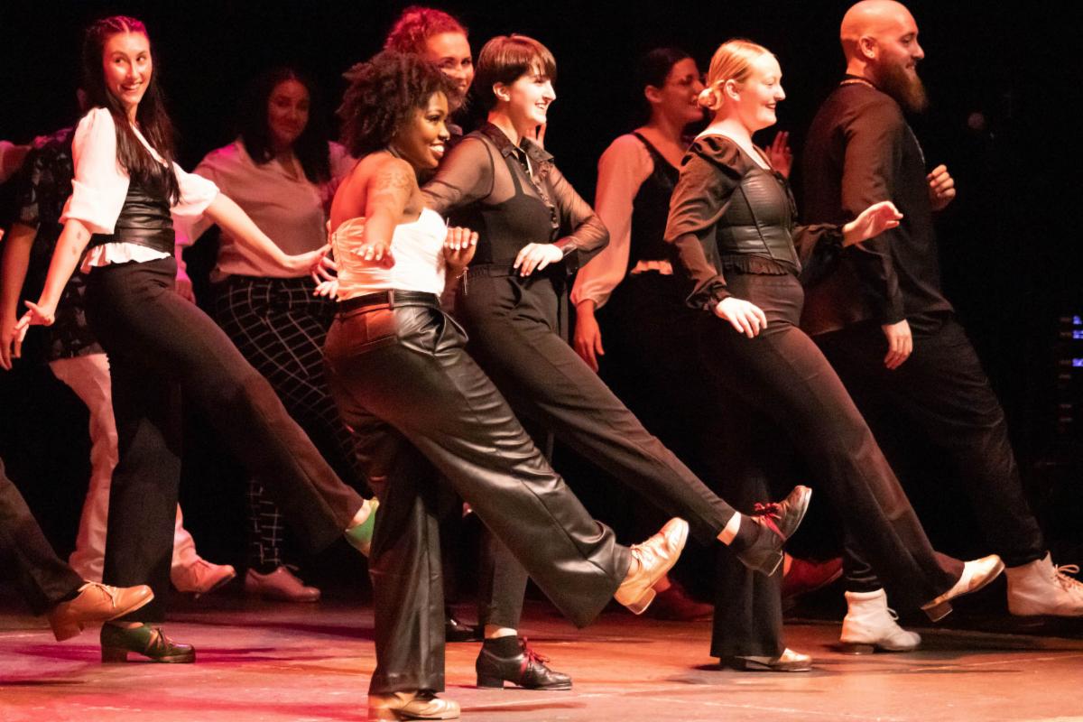 Members of Chicago Tap Allstars perform “Tin Tin Deo,” choreographed by Star Dixon. (L to R): Andrew Carr, Patti Vickerman, William Wims, Chris Matthews, Star Dixon, Liora Lahav, Sara Anderson and Amber Buchanan at Chicago Tap Allstar's Winter Wonderland, December 9, 2023, at the Harold Washington Cultural Center. Photo by Theon Reynolds