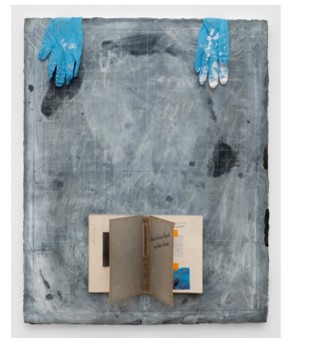 Light Handed, 2020,. Acrylic, chalk, high-polymer film lead, book titled How to Know People by Their Hands and nitrile gloves on panel. Photo by Erin Washington.