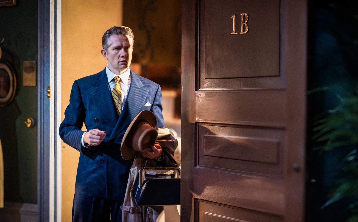 Kudos to director Adam Immerwahr on a terrific production. I must compliment Scenic Designer Paige Hathaway on the gorgeous set. As I mentioned earlier, it’s a posh Mayfair flat complete with hunting prints and a drinks cart – essentials in a British drawing room. If you look carefully, you’ll notice that real rain is falling outside the floor to ceiling French doors!