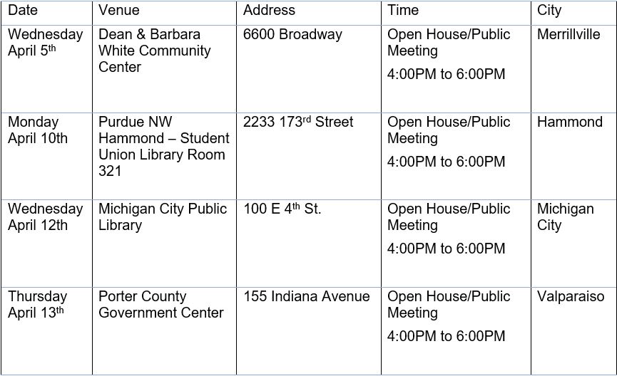 To request alternate formats for the Open House and Public Hearing, please contact Candice Eklund at NIRPC at least 48 hours prior at (219) 763-6060 or at ceklund@nirpc.org. Individuals with hearing impairments may contact us through the Indiana Relay 711 service by calling 711 or (800) 743-3333.