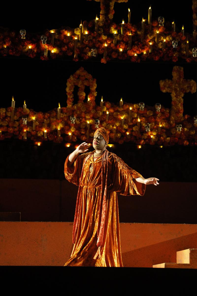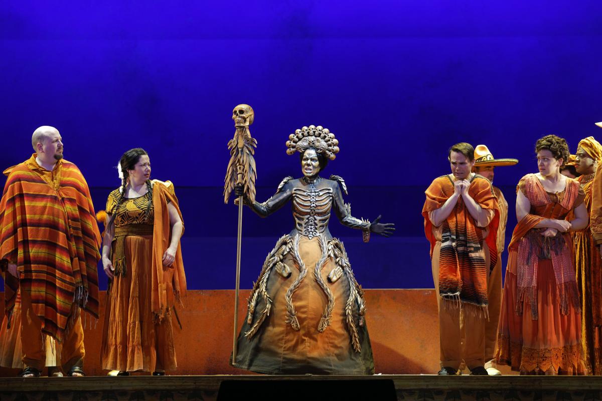 For the second time in just as many months, Grammy Award-winning soprano Ana Maria Martinez effortlessly steals the show once again at Lyric Opera of Chicago. If you were fortunate to have seen her Despina in Mozart's "Cosi fan tutte" earlier this season, you have an idea of what you are in store for here. Martinez once again gets to be decked out in the production's flashiest costumes (same as in "Cosi") and she has such strong instincts as an actor that it's nearly impossible to take your eyes off of her any time that she is on the stage. Martinez sings the role of Catrina, Keeper of the Dead, and finds humor in the drollest of macabre moments. It's a physically and vocally challenging role, but Martinez brings it off with aplomb. Martinez imbues her Catrina with quirky movements and constant gestures as the character is always in motion. Under Martinez's skilled training, it all looks and feels 100% authentic.
