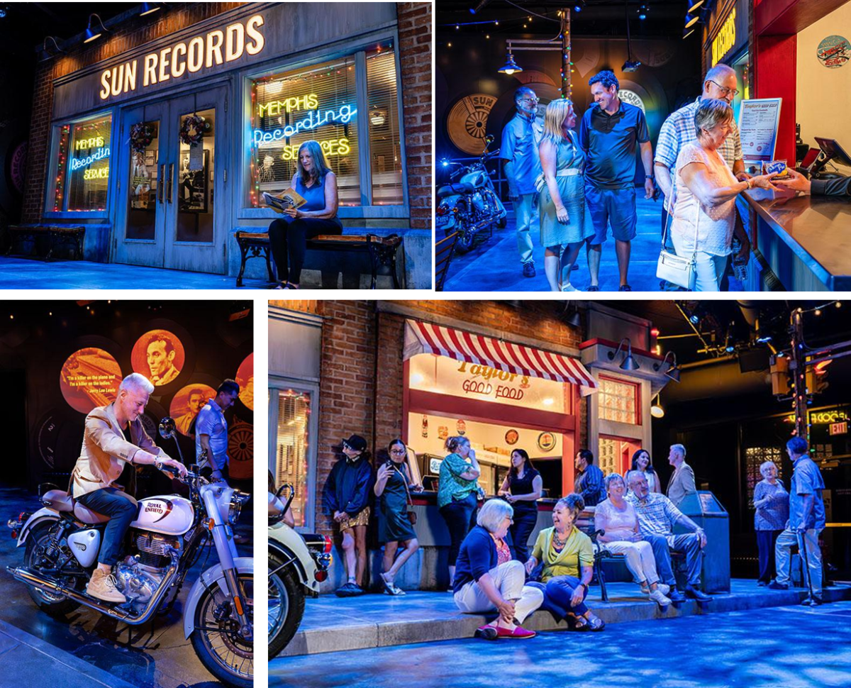 As soon as audiences step into the lobby, they find themselves standing right outside the Sun Records recording studio in Memphis, Tennessee, where they can take selfies astride a vintage motorcycle, view displays about the history of the play, and step up to the Taylor’s Good Food concession counter for affordable snacks and beverages.