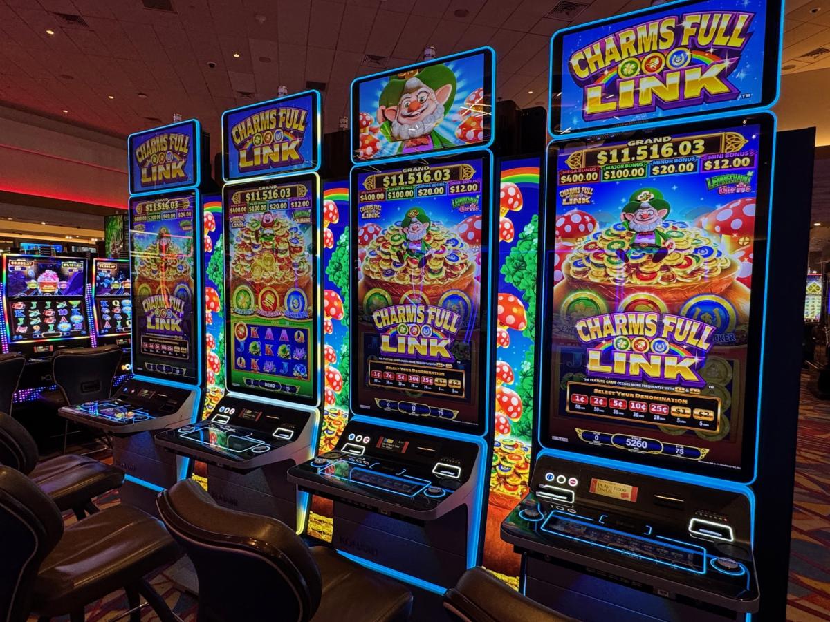 And if you are feeling the luck of the Irish, you can try your hand at one of our leprechaun themed games. In Charms Full Link by Konami Gaming, a magical leprechaun will keep you entertained on your journey to win a pot of gold. It features bright beautiful graphics of shamrocks, rainbows, mushrooms, and overflowing pots of gold. The game features Celtic coins, leprechaun hats, golden harps, and more. Guests will find this bank of four new games near the main entrance.