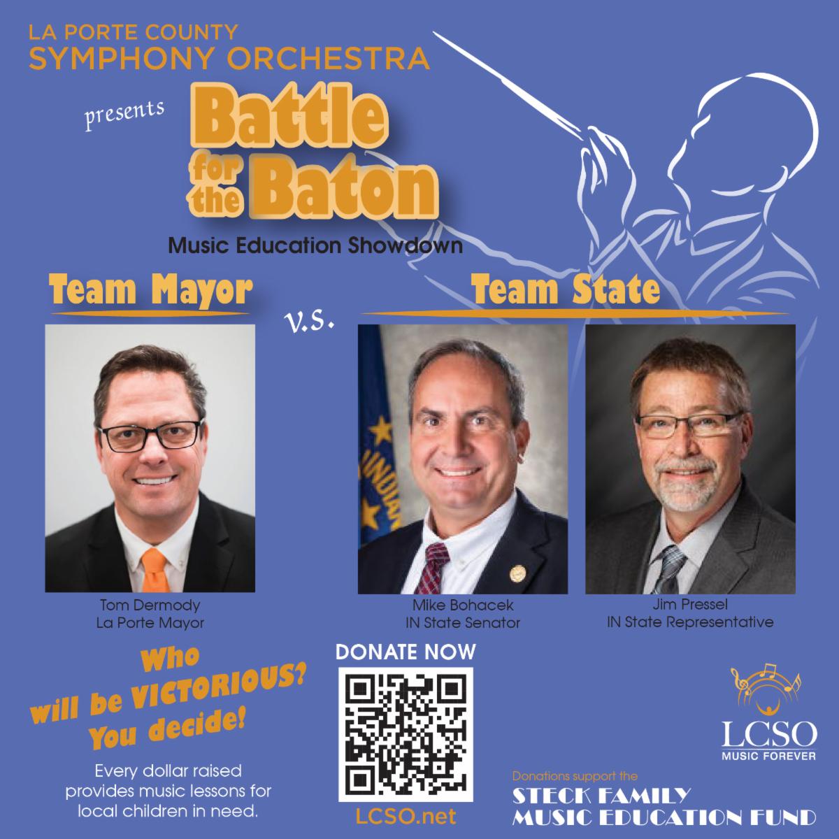 The LaPorte County Symphony Orchestra (LCSO) is excited to announce the Battle for the Baton fundraiser to support the Steck Family Music Education Fund with a friendly competition launched June 10 with the Baton honors bestowed upon the winner at the free summer concert at Friendship Gardens on July 21.