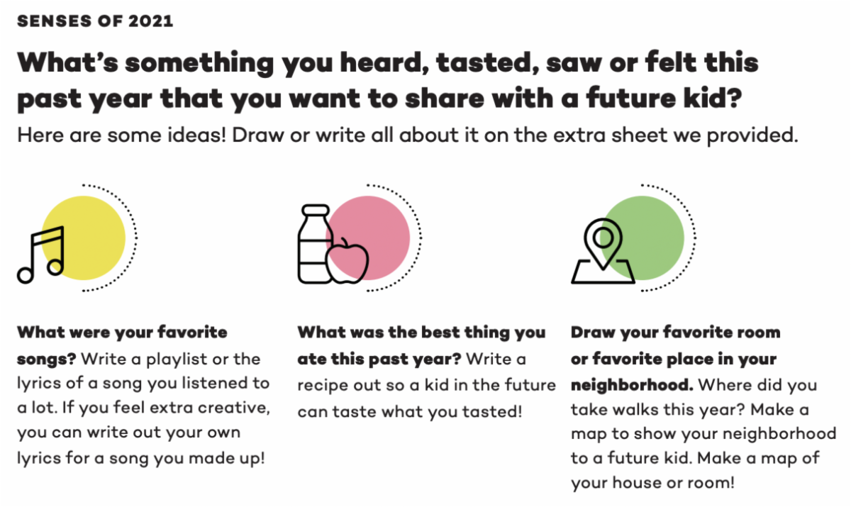 To spur participation, organizers have posted fun, easy “How to Create Your Time Capsule” resources for kids and families on OurTimeCapsule.org/resources.