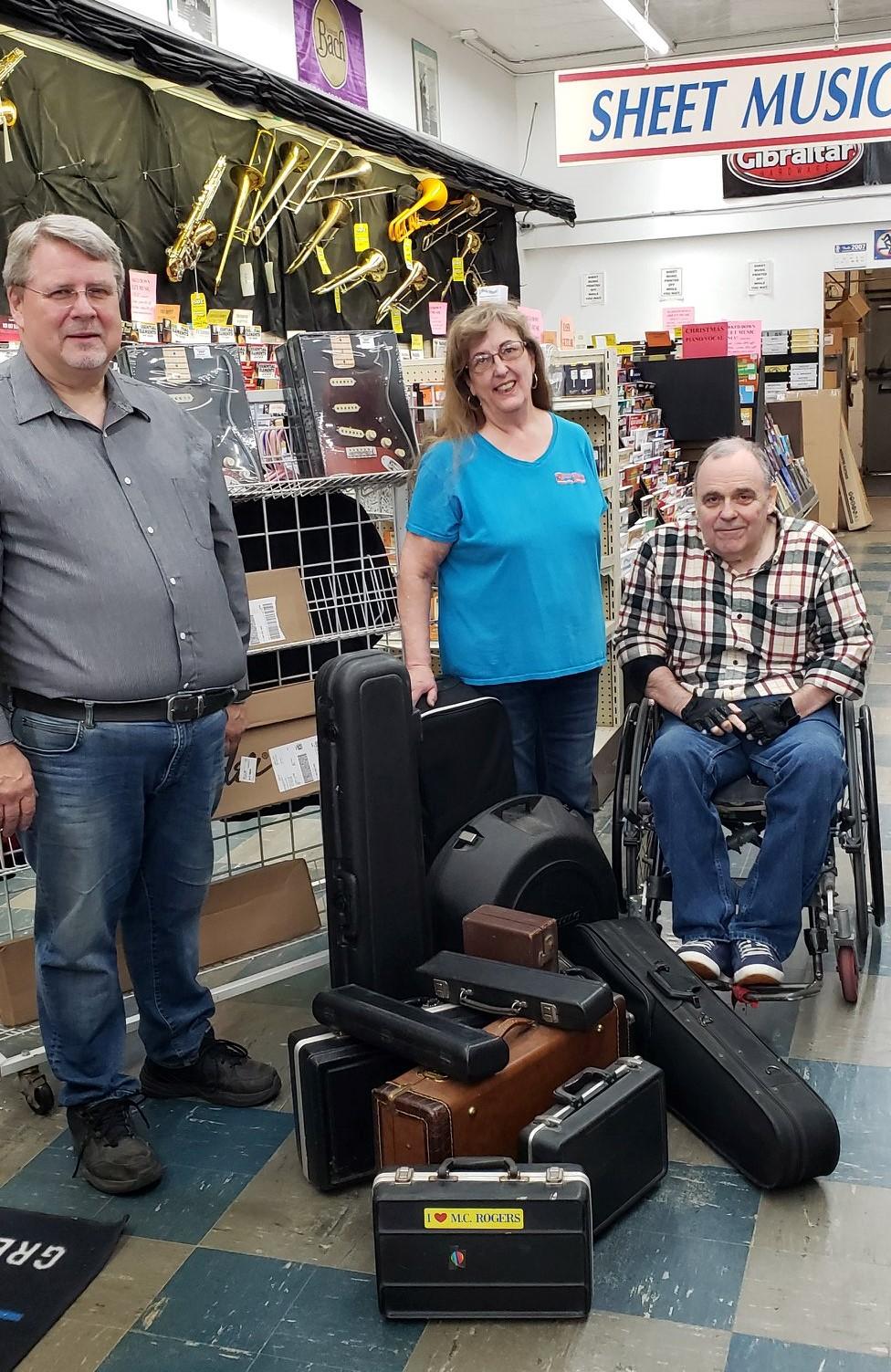L-R: LCSO Interim Music Director, Chuck Steck, and Joan Davis and Bill Heiss of Roxy Music. The instruments were collected by Roxy Music and will be repaired by Drew's Gift of Music before being redistributed to deserving music students in our area who could not otherwise lease or rent the instrument.