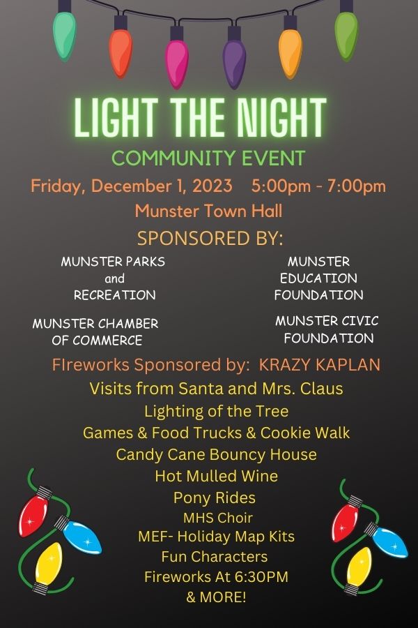 Munster Parks & Recreation, Munster Chamber of Commerce, Munster Education Foundation & Munster Civic Foundation present the 3rd Annual Light the Night Community Event in front of Munster Town Hall, 1005 Ridge Road, Munster.