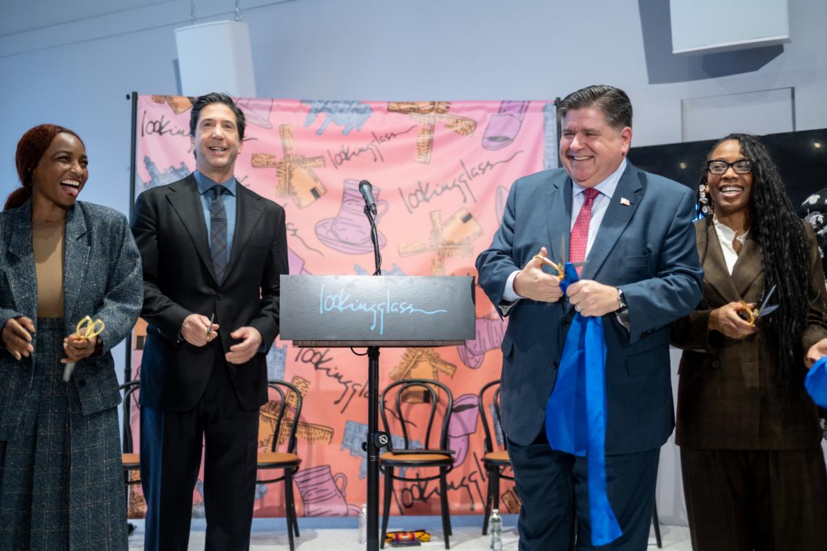 Creative Producer – Mellon Playwright in Residence and Ensemble Member J. Nicole Brooks, Founding Ensemble Member, Board Member, Actor and Director David Schwimmer, Illinois Governor JB Pritzker and Chicago Deputy Mayor Kenya Merritt at the ribbon cutting held by Lookingglass Theatre Company, Monday, Jan. 27 at Water Tower Water Works, 163 E Pearson St. at Michigan Ave. Photo by In the Black Photography