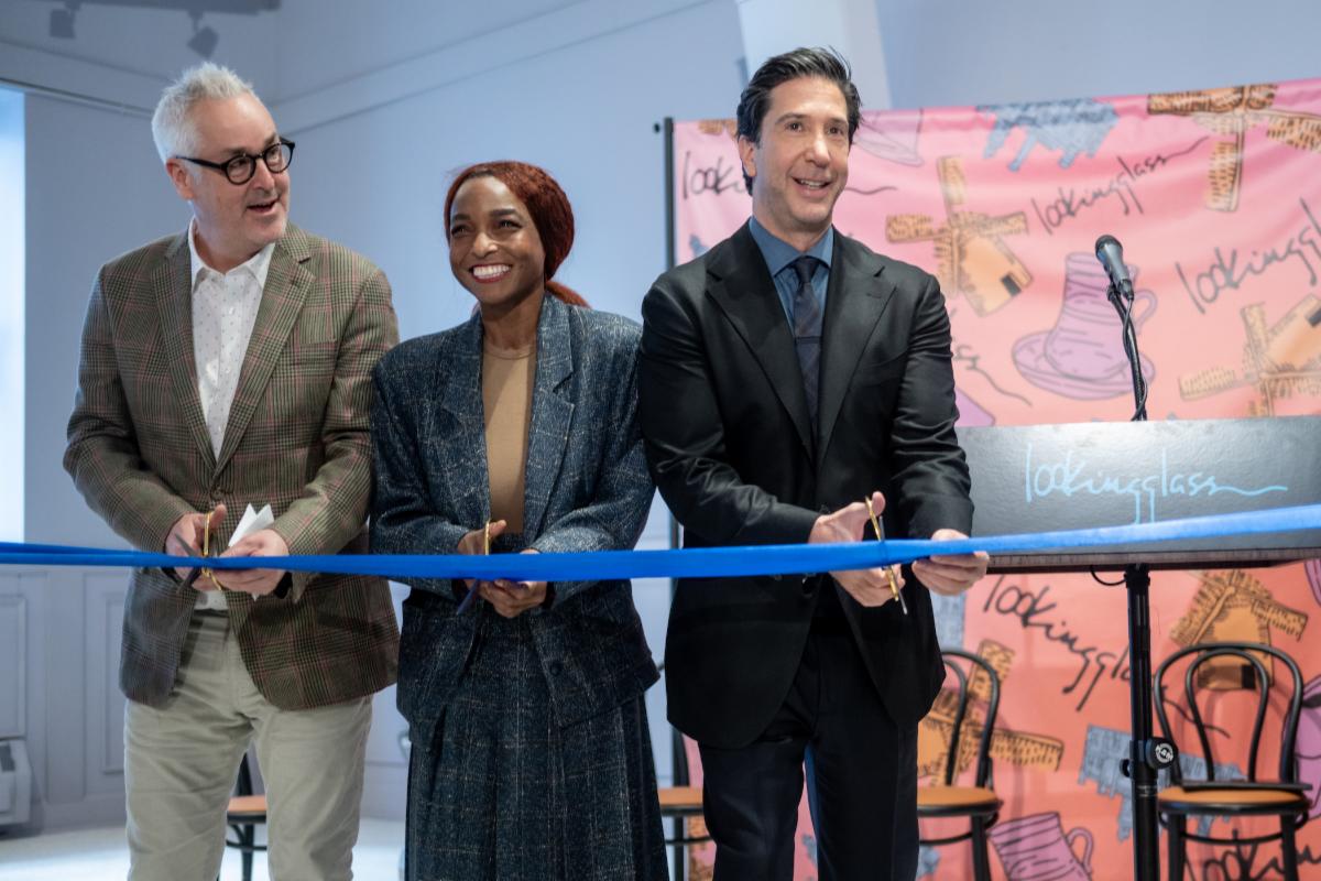 (L to R) Lookingglass Casting Director and Ensemble Member Phil Smith, Creative Producer – Mellon Playwright in Residence and Ensemble Member J. Nicole Brooks and Founding Ensemble Member, Board Member, Actor and Director David Schwimmer at the ribbon cutting held by Lookingglass Theatre Company, Monday, Jan. 27 at Water Tower Water Works, 163 E Pearson St. at Michigan Ave. Photo by In the Black Photography