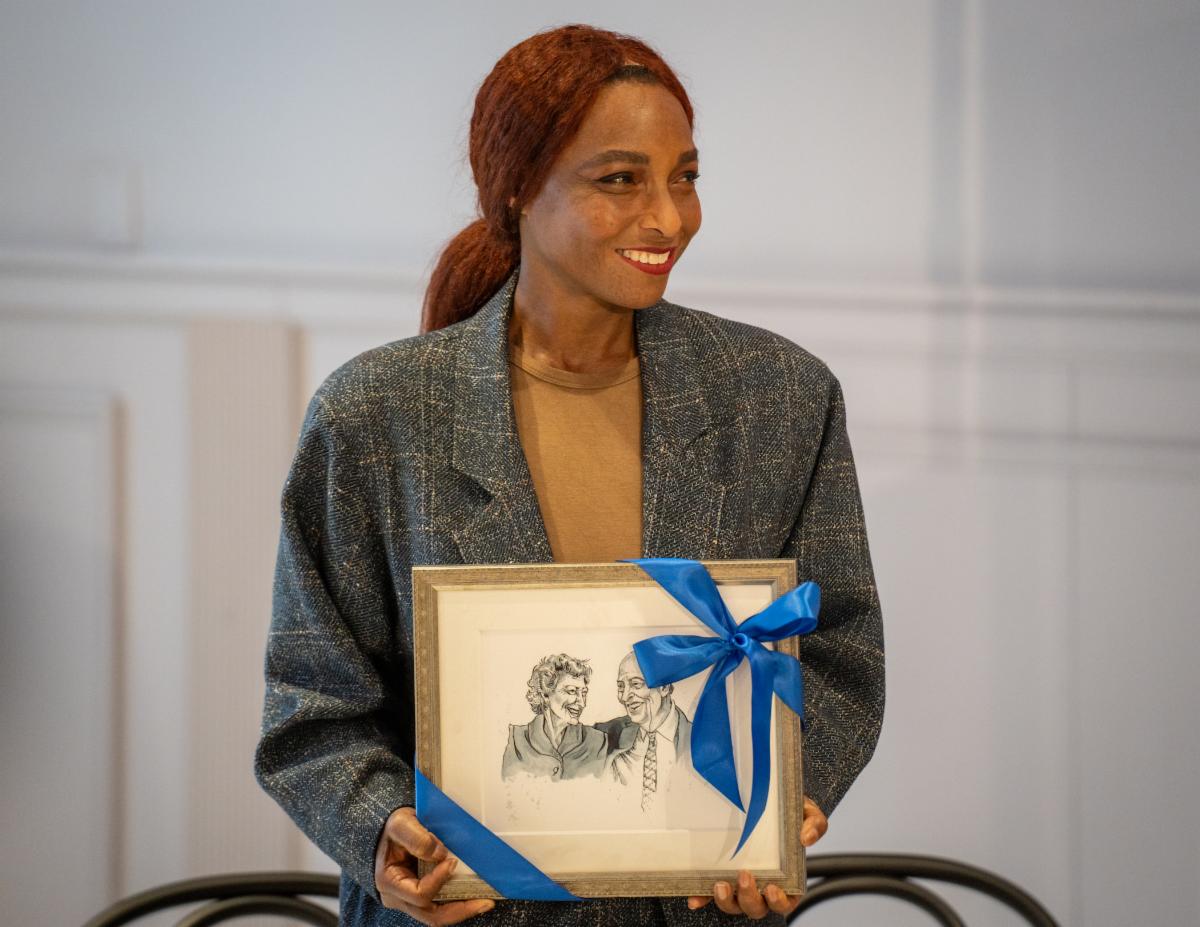 Creative Producer – Mellon Playwright in Residence and Ensemble Member J. Nicole Brooks holding an illustration by artistic associate Sully Ratke of Lookingglass’ longtime supporters Joan and Paul Rubschlager for whom the The Joan and Paul Theater has been named at the dedication of the Joan and Paul Theatre and ribbon cutting held by Lookingglass Theatre Company, Monday, Jan. 27 at Water Tower Water Works, 163 E Pearson St. at Michigan Ave. Photo by In the Black Photography