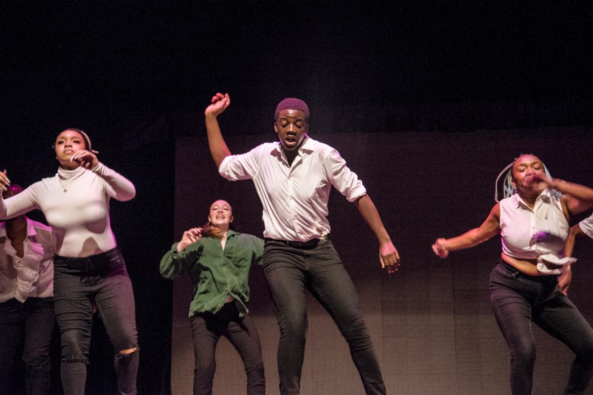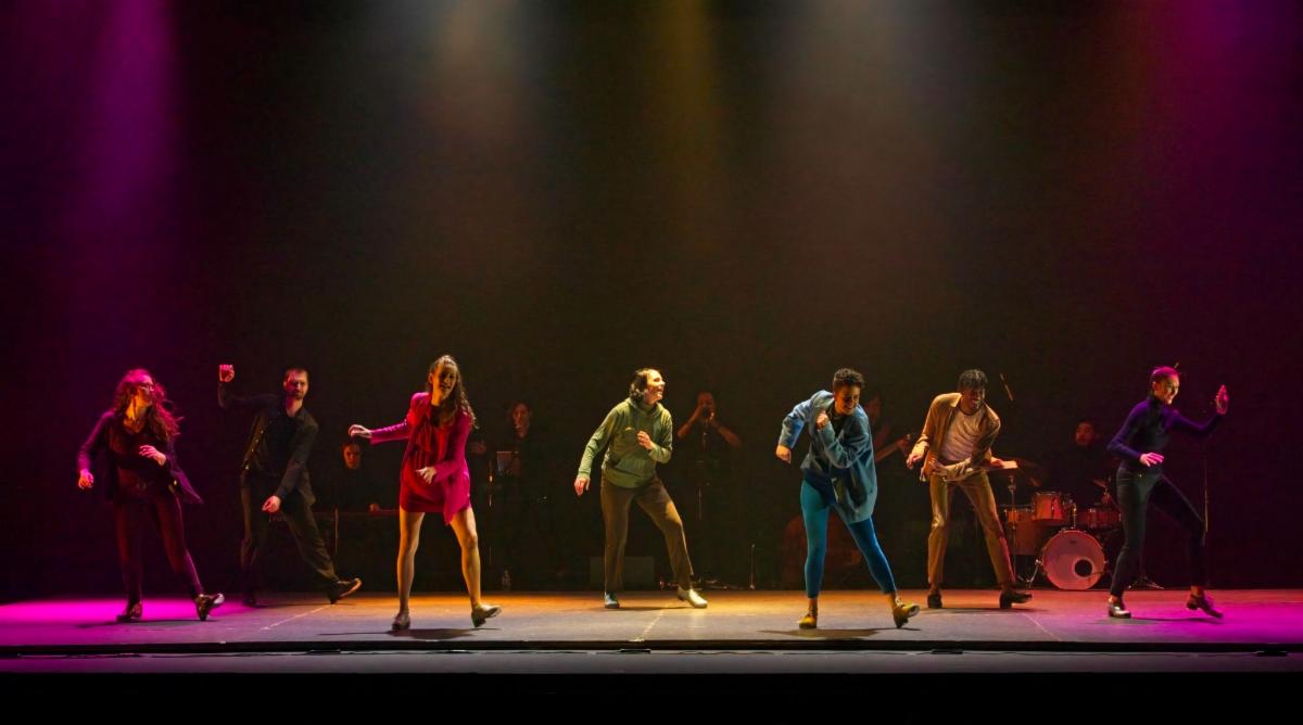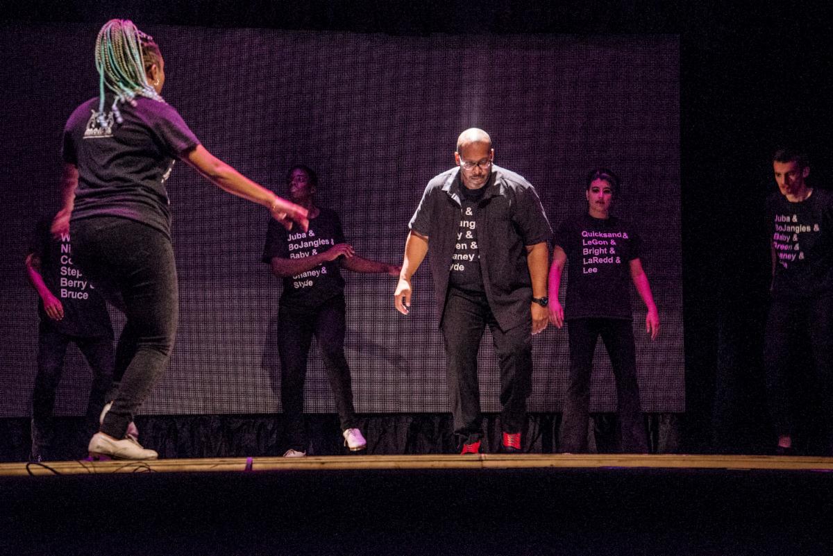 Bril Barrett (center) of M.A.D.D. Rhythms from the October 2021 performance of HOOFIN’ IT. Photo by Nate Crossley