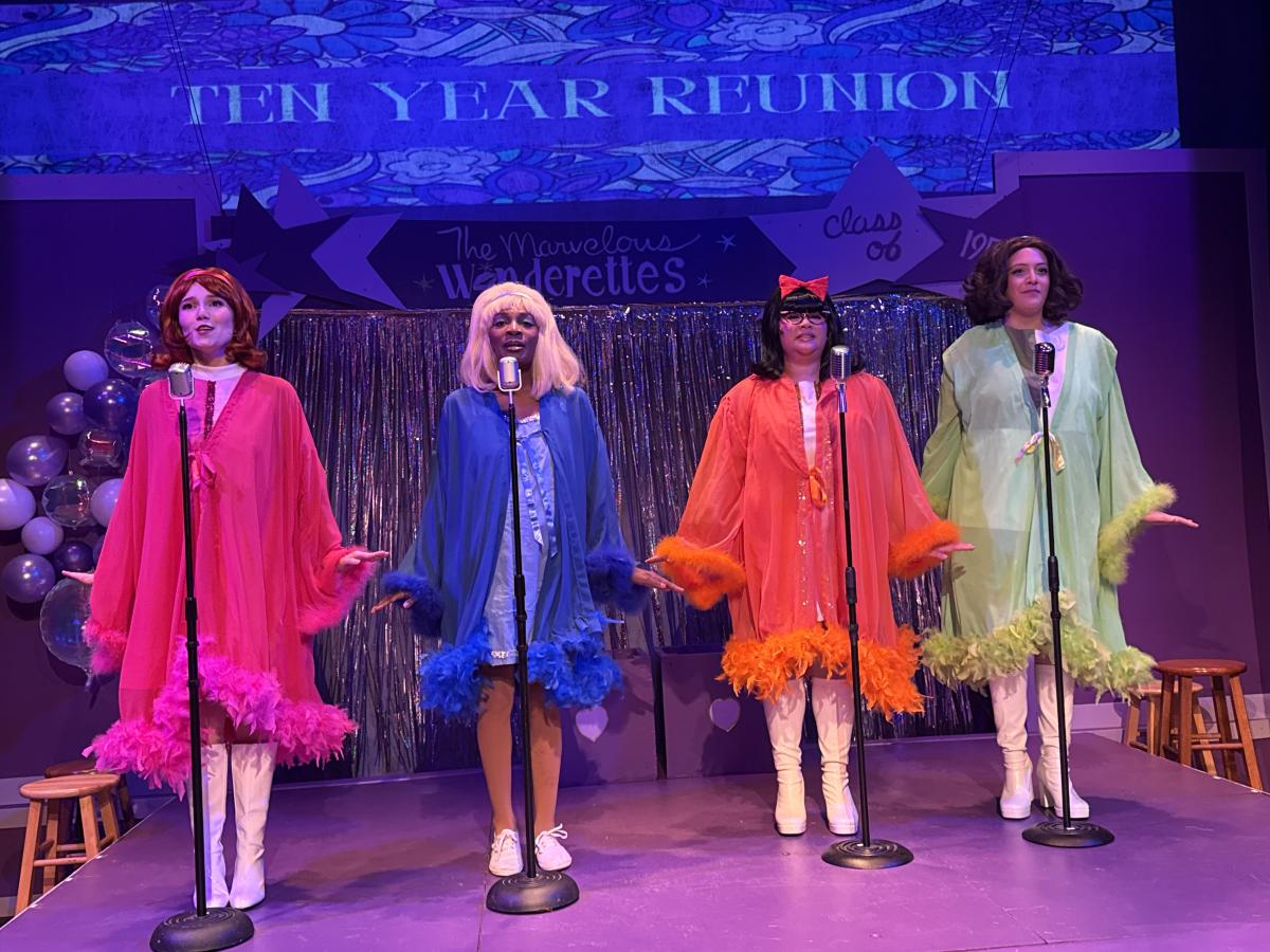 As Act II opens, our four heroines have returned to entertain at their 10-Year Reunion. ‘50s prom dresses have given way to the mod stylings of the ‘60s – teased hair, go-go boots, feather and/or fur trimmed robes and mini-dresses in their signature colors. Grimacing, Suzy throws down her boots and rubs her back, she and Ritchie are expecting a baby.