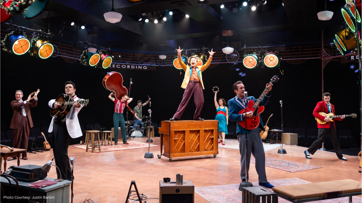 After a short pause, everyone returns to the stage wearing sequins, and suddenly, it’s a concert after the musical! Elvis sings I’ll Be Home for Christmas and Santa Claus is Coming to Town. Perched on top of the piano, Dyanne strums a ukelele and leads the company in Mele Kalikimaka. Johnny Cash lends his deep voice to God Rest Ye Merry Gentlemen. Jerry Lee Lewis does acrobatic moves on his piano as he plays and sings Jingle Bells. The finale – Carl Perkins rocks with Run, Rudolph, Run.