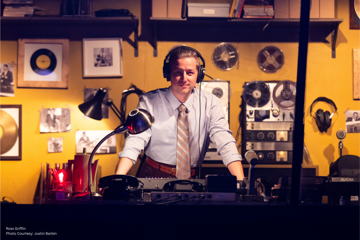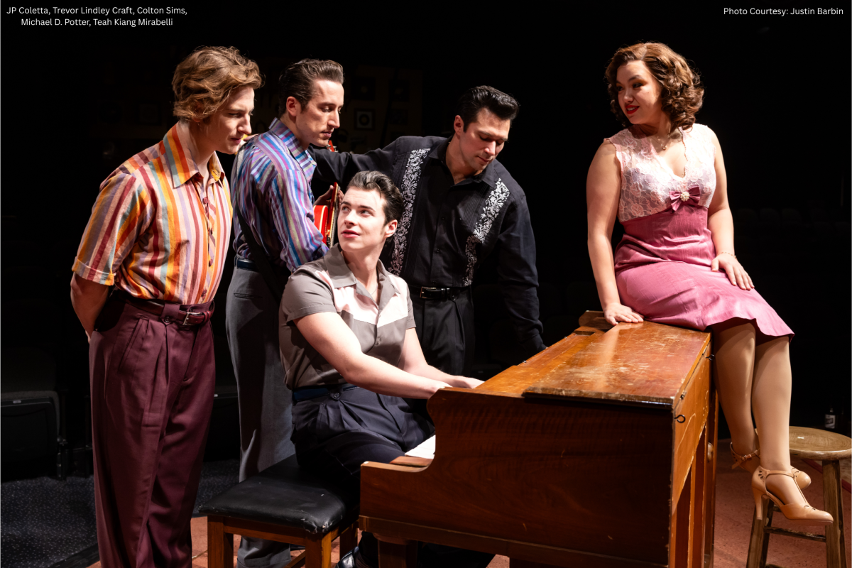 Million Dollar Quartet Christmas begins (instead of ending) with that famous snapshot of the foursome around the piano. It’s the Christmas season and Sam Phillips (Ross Griffin) has gifts for Carl Perkins (Trevor Lindley Craft), Johnny Cash (Michael D. Potter) and Elvis Presley (Colton Sims), so he invites them to stop in at the studio. His newest discovery, a brash Jerry Lee Lewis (JP Coletta), was already there, jamming with brother Jay (Cody Siragusa) and Fluke (Jed Feder) when the guys – and Elvis’ girlfriend, Dyanne (Teah Kiang Mirabelli) strolled in.