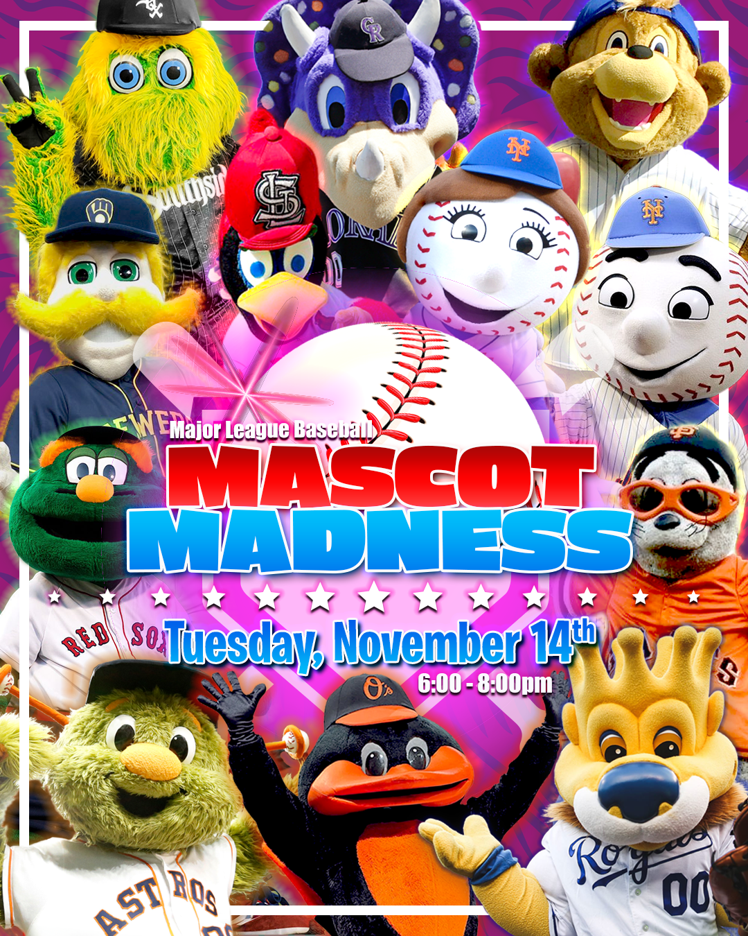 An MLB lover's dream. 11 MLB Mascots, one night only, right here at the Mascot Hall of Fame!