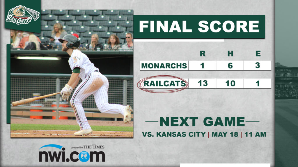The Gary SouthShore RailCats (3-2) put up a crooked number in their trip to the plate and never looked back as they stormed past the Kansas City Monarchs (1-4) 13-1.