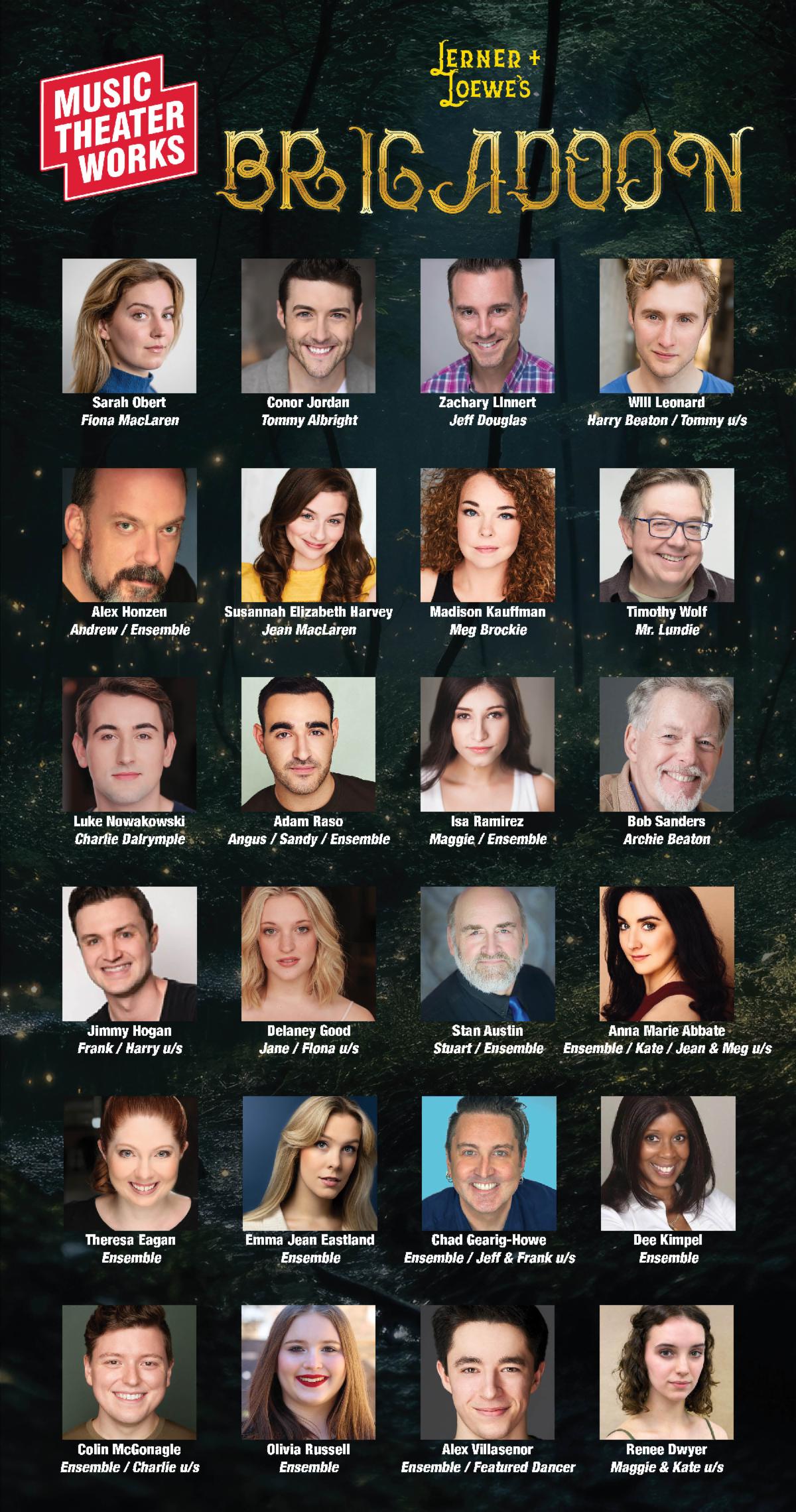 The cast of Lerner and Loewe’s Brigadoon includes Sarah Obert (Fiona MacLaren, she/her); Conor Jordan (Tommy Albright, he/him); Zachary Linnert (Jeff Douglas); Will Leonard (Harry Beaton/Tommy U/S, he/him); Alex Honzen (Andrew MacLaren/ensemble, he/him); Susannah Elizabeth Harvey (Jean MacLaren, she/her); Madison Kauffman (Meg Brockie, she/her); Timothy Wolf (Mr. Lundie, he/him); Luke Nowakowski (Charlie Dalrymple, any pronouns); Adam Raso (Angus MacGuffie/Sandy Dean/ensemble, he/him); Isa Ramirez (Maggie Anderson/ensemble); Bob Sanders (Archie Beaton, he/him); Jimmy Hogan (Frank/Harry U/S, he/him); Delaney Good (Jane/Fiona U/S, she/her)and Stan Austin (Stuart Dalrymple/ensemble, he/him).