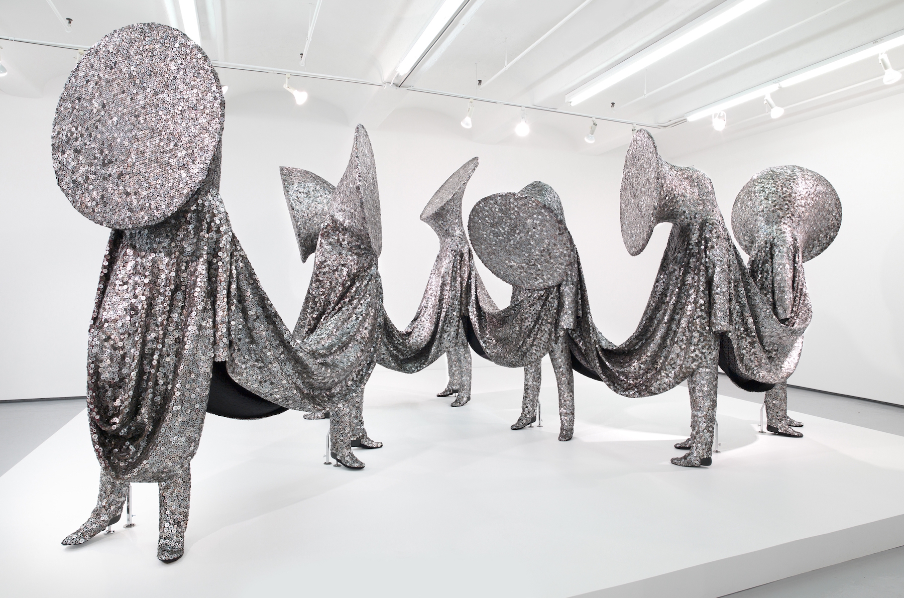 Reflecting the artist’s three-dimensional approach, the exhibition is designed as an immersive journey that begins with Spinner Forest and continues in the galleries with the artist’s cast bronze sculptures, tapestries made of sequined garments, color-saturated videos, and breath-taking installations such as the larger-than-life Beaded Cliff Wall that is comprised of millions of colorful pony beads threaded into shoelaces by hand. Displayed against a backdrop of floor-to-ceiling geometric vinyl wallpaper collaboratively designed with the artist’s partner Bob Faust, Forothermore traces artistic themes and Cave’s evolving interests over three decades, with works from as early as 1989.