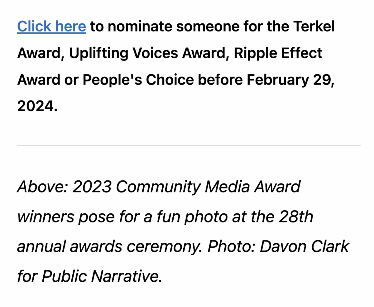 - The Ripple Effect Award acknowledges journalists whose work has significantly impacted beyond Chicago.