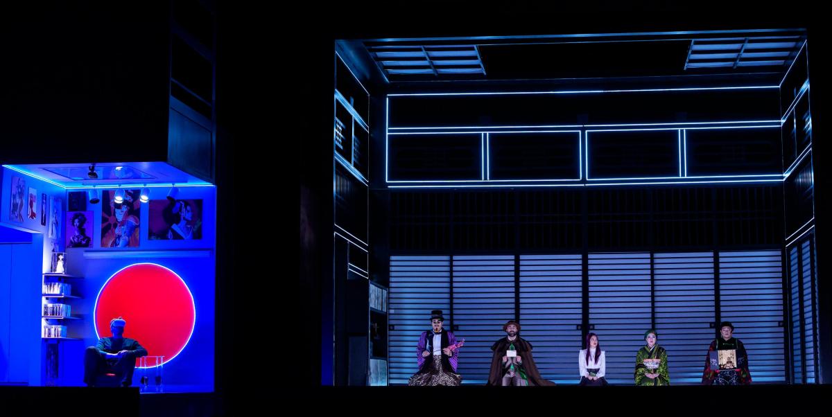 To me, the problem with “Butterfly” as a virtual-headset construct is twofold: first, I didn’t read the program before I saw the production (I never do, purposely), so I frankly had no idea what was going on for a while. I was not clear on what the point was of cramming the lush set and gorgeous, colorful costumes and settings into the little box, literally and figuratively, placed within Pinkerton’s cold-looking kitchen with its cold lighting. Why, I wondered, were we the audience being forced to encounter these colorful characters twice removed -- crammed into a story within the story?