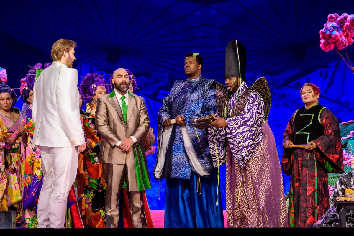 Rodell Rosel as Goro, Zachary Nelson as Sharpless, and Evan LeRoy Johnson as Pinkerton. Photo by Todd Rosenberg
