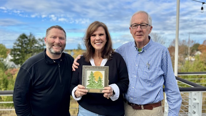 The Board of Directors of Peninsula Players Theatre, America’s oldest professional resident summer theatre, recently honored Peggy Reineck Simpson for her six years of service to the organization. Managing Director Brian Kelsey and Board Chair Tom Birmingham presented Reineck Simpson with a plaque to honor her service.