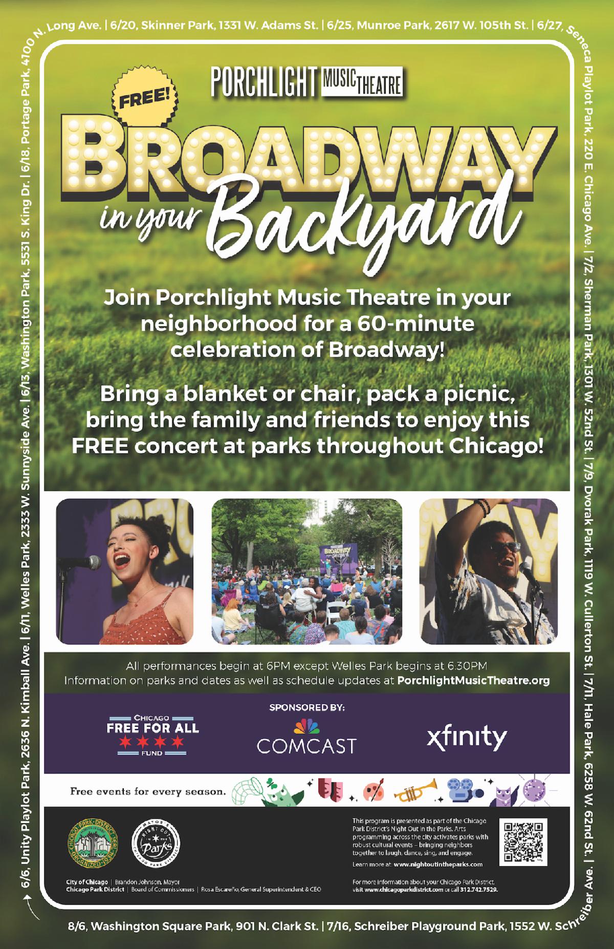 Broadway in your Backyard is part of Chicago Park District’s Night Out in the Parks series, supported by the Mayor’s Office and Chicago Department of Cultural Affairs and Special Events with lead sponsors Free For All, Comcast and Xfinity and, in part, by Unity Park Advisory Council and Trader Joe's.