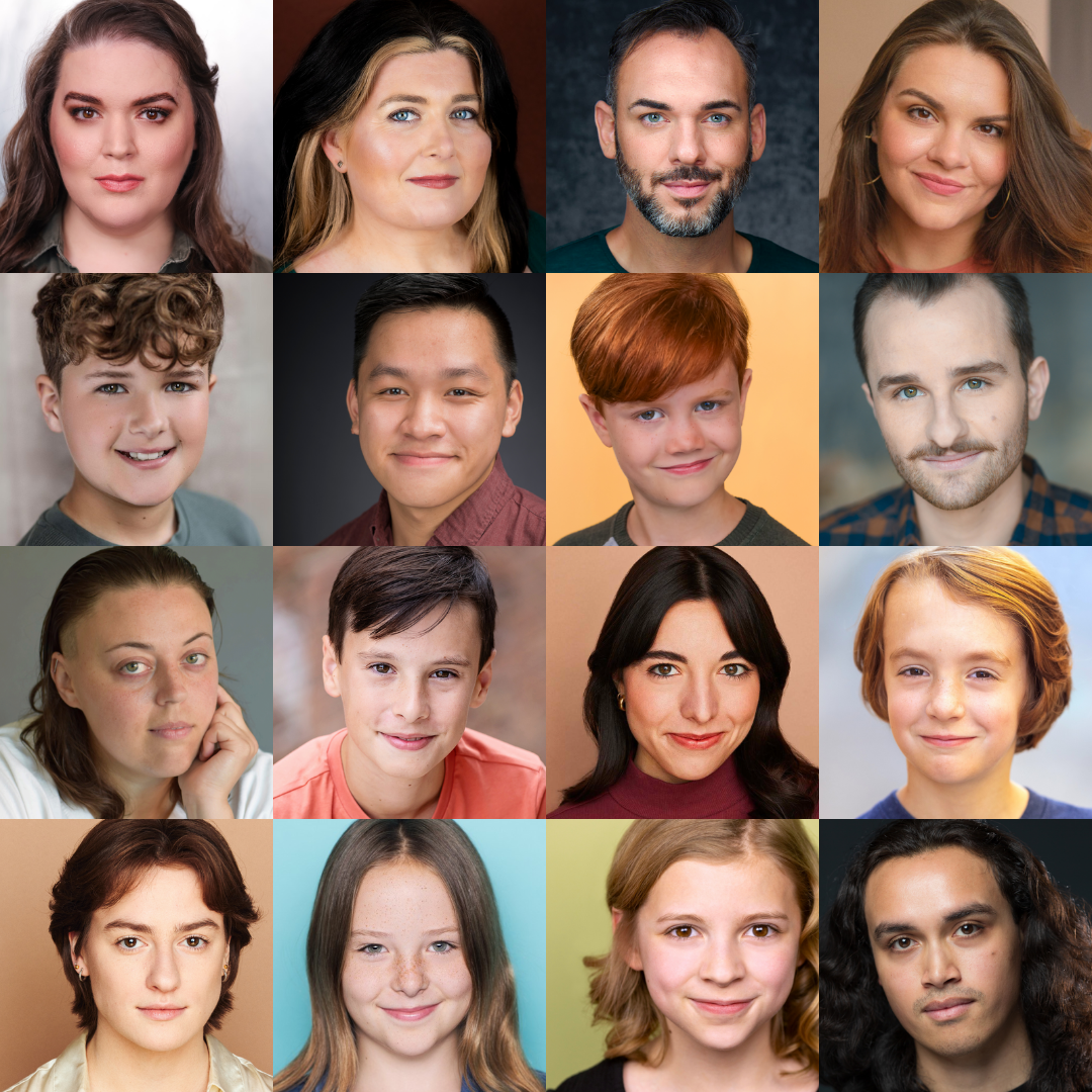 Third row: (L to R) Dakota Hughes (Joan, dance/intimacy captain), Charlie Long (Christian), Adelina Marinello (middle Alison U/S, Joan U/S), Hayes McCraken (small Alison)
