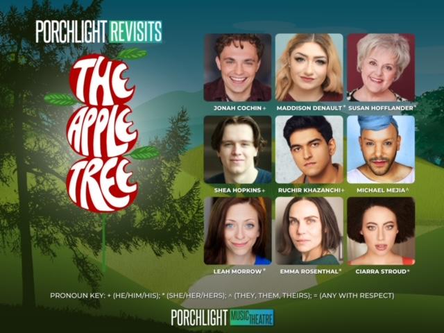 The cast of Porchlight Revisits The Apple Tree includes Jonah Cochin+ (Adam/ensemble); Maddison Denault* (Princess Barbara/ensemble); Susan Hofflander* (Snake/ensemble); Shea Hopkins+ (Flip/The Prince/ensemble); Ruchir Khazanchi+ (Captain Sanjar/ensemble); Michael Mejia^ (Balladeer/ensemble); Leah Morrow* (Ella/Passionella/Ensemble); Emma Rosenthal* (Narrator/ensemble) and Ciarra Stroud* (Eve/ensemble).